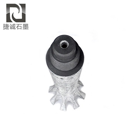 石墨转子工作原理为旋转的转子将吹人铝熔体中的氮气(或氩气)破碎成大量的弥散气泡,并使其分散在金属液中。气泡在熔体中靠气体分压差和表面吸附原理,吸收熔体中的氢,吸附氧化夹渣,并随气泡上升而被带出熔体表面,使熔体得以净化。由于气泡细小弥散,与旋转熔体均匀混合,并随之转动呈螺旋形缓慢上浮,与熔体接触时间长,不会形成连续直线上升产生的气流,从而显著提高了净化效果。